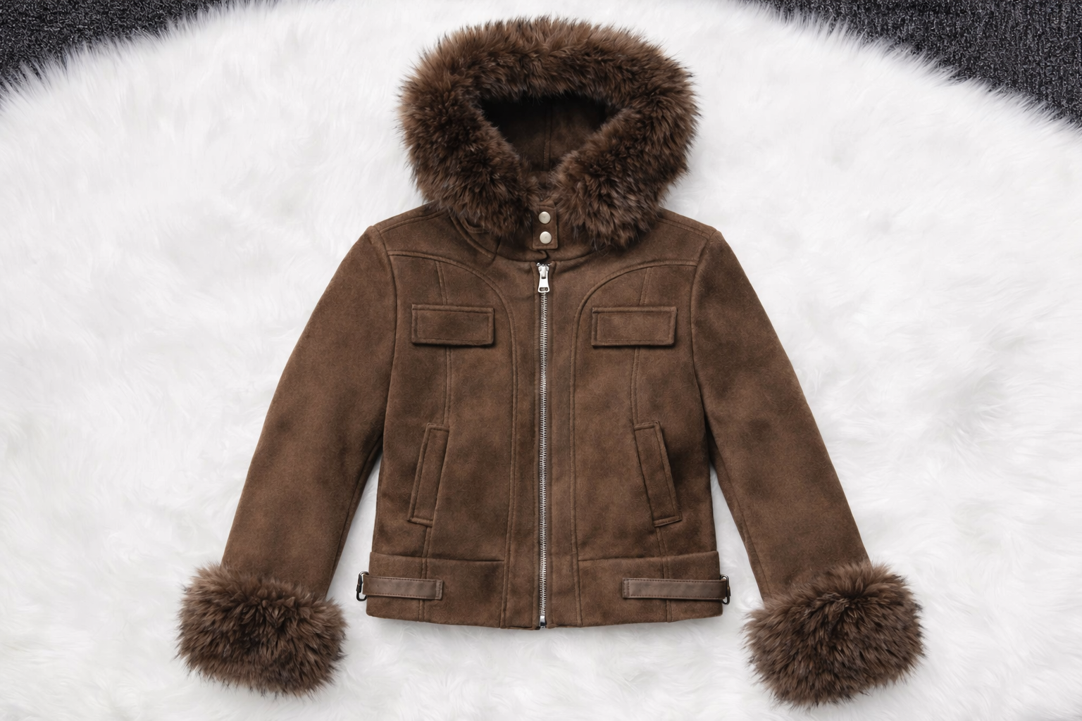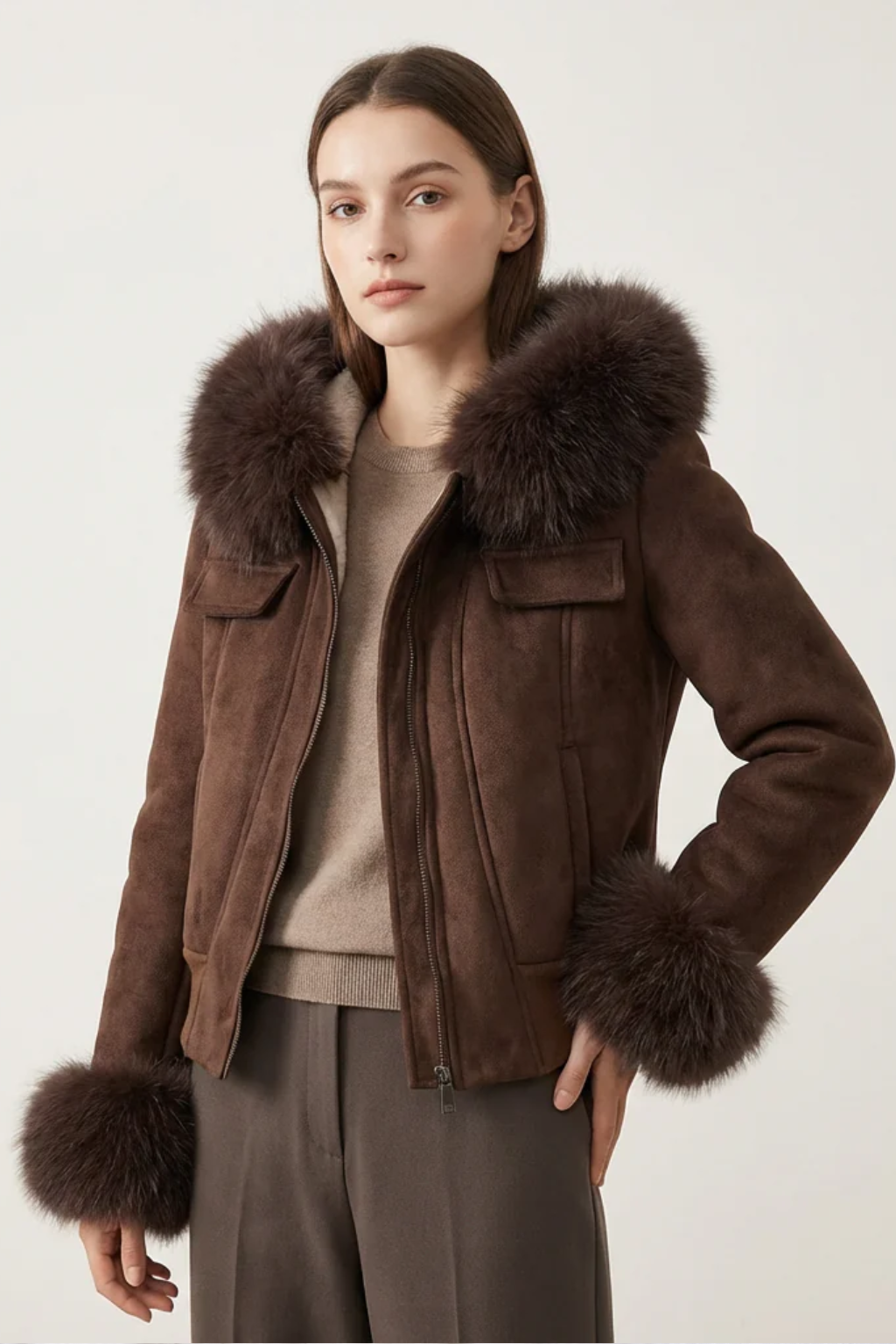 Kurtka wyróżnia się wyjątkowo delikatną, jednolitą powierzchnią o naturalnym, szlachetnym wyglądzie. Materiał pięknie układa się na sylwetce, zapewniając komfort noszenia i efekt „miękkiej elegancji”, charakterystyczny dla luksusowych modeli. Całość dopełnia efektowne futrzane wykończenie kaptura i mankietów, które nadaje kurtce wyrazisty, prestiżowy charakter.